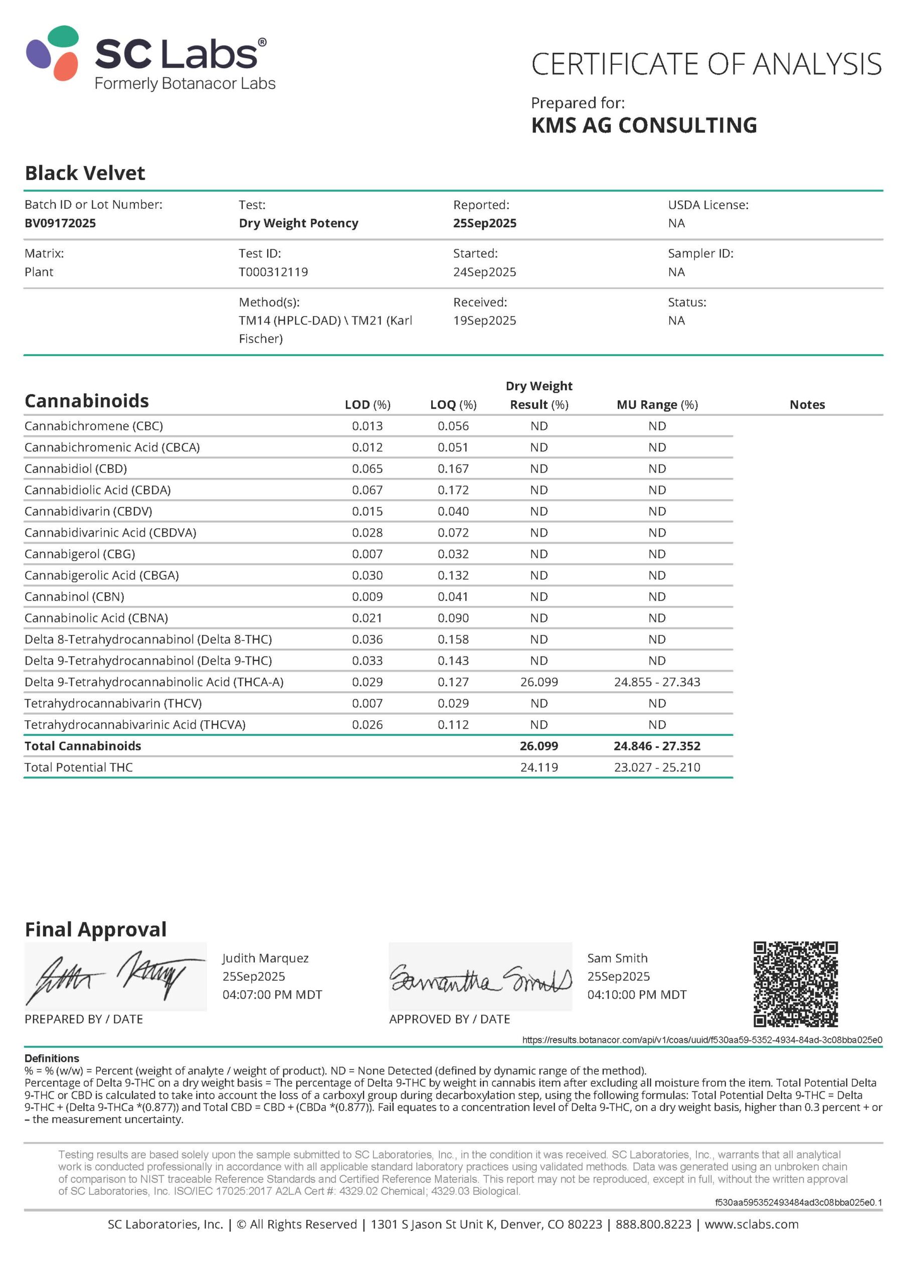 Black Velvet is a refined hybrid recognized for its even genetic balance and classic presentation. This flower stands out for its smooth character, visual appeal, and subtle complexity, making it a timeless addition to any collection.